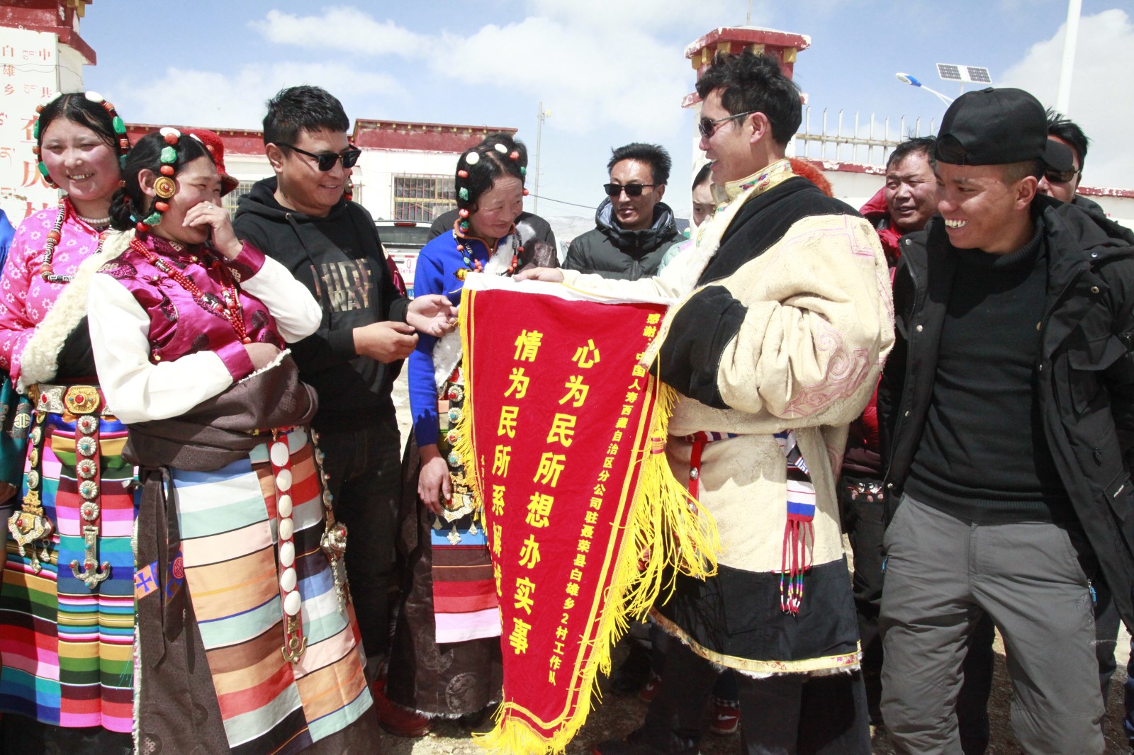 圖為中國人壽西藏分公司三個駐村點均如期實現(xiàn)整村脫貧,駐村工作隊持續(xù)開展工作鞏固脫貧成果,白雄鄉(xiāng)查慶村干部群眾為公司駐村工作隊送上錦旗表示感謝。