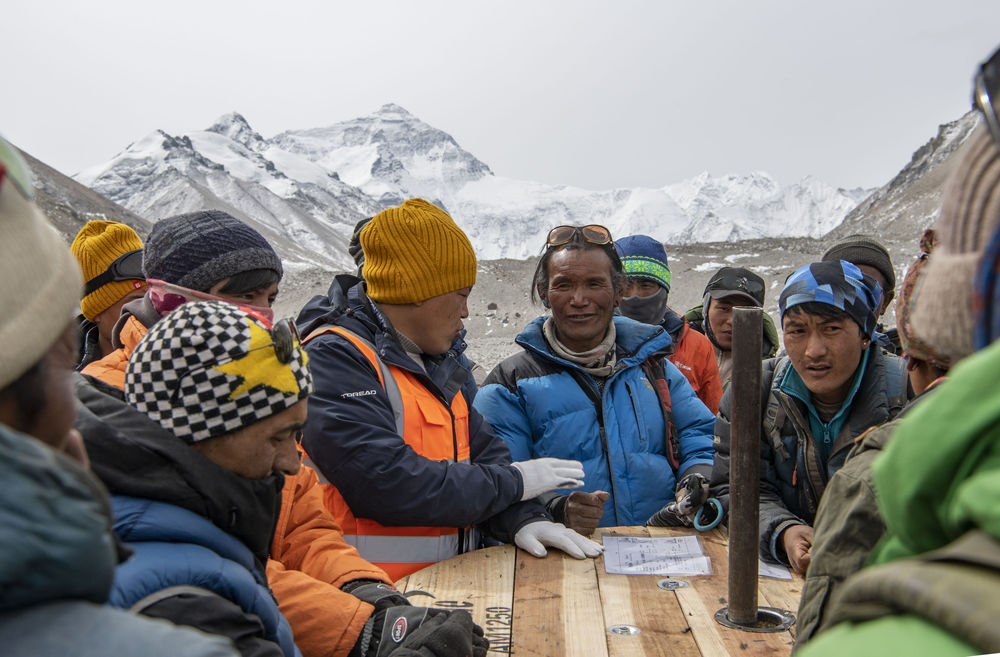 格桑(中間穿藍(lán)色羽絨服者)和其他村民一起商議將光纖運(yùn)送到海拔6500米前進(jìn)營地的方法(2020年4月15日攝)。2020珠峰高程測量期間,為保障峰頂信號(hào)質(zhì)量,網(wǎng)絡(luò)運(yùn)營商需要將光纖鋪設(shè)至海拔6500米的珠峰前進(jìn)營地。格桑和其他村民一起,承擔(dān)起運(yùn)輸光纖的任務(wù)。