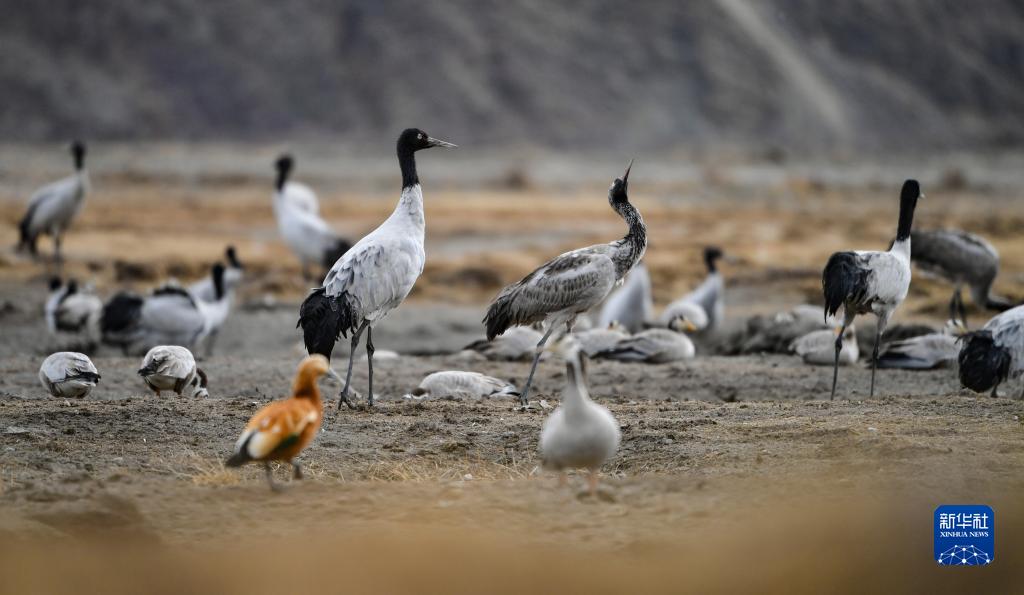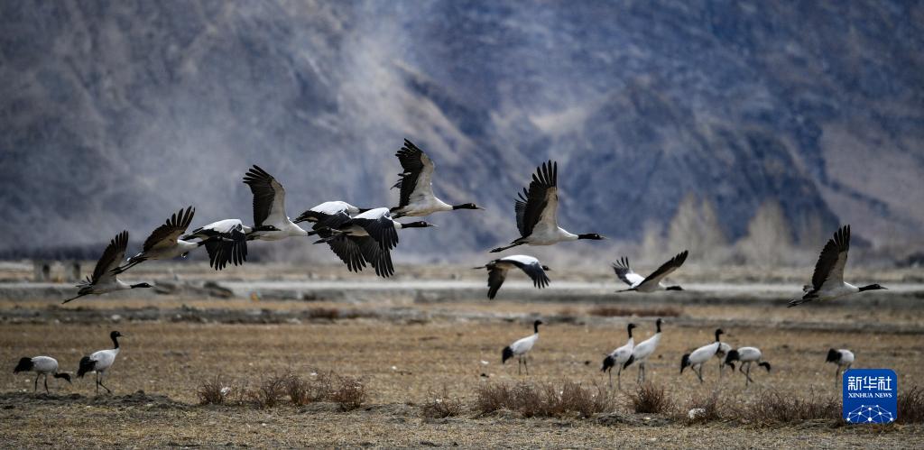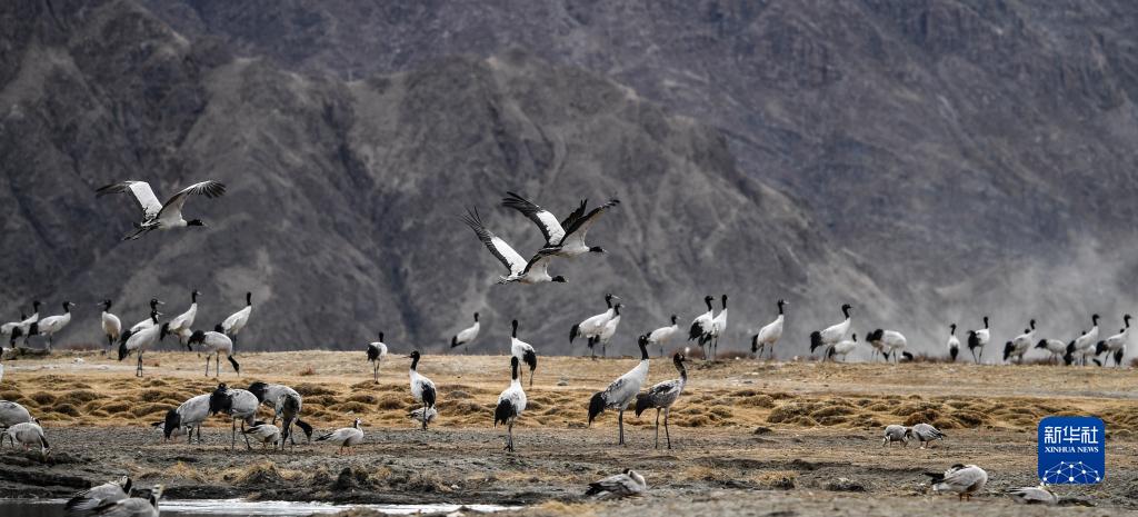 在西藏雅魯藏布江中游河谷黑頸鶴國家級自然保護區(qū)日喀則片區(qū)拉孜縣附近,大量越冬的黑頸鶴翩翩起舞,迎接春天的到來。