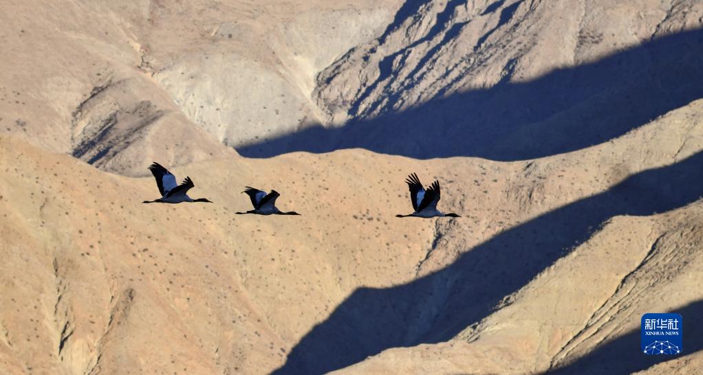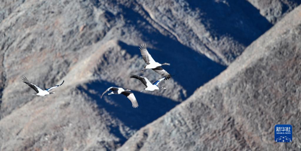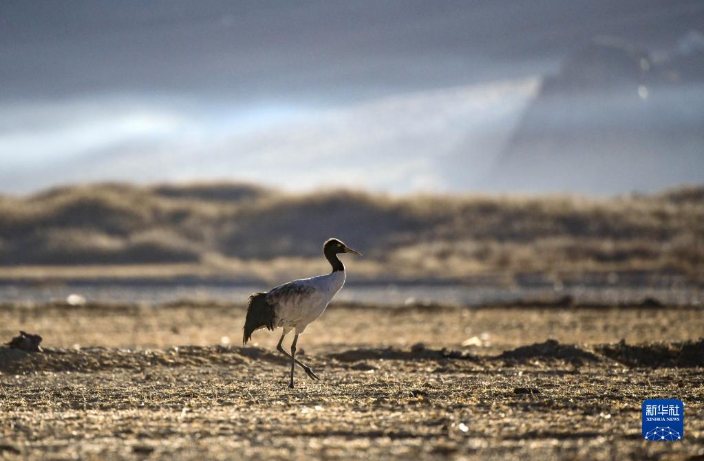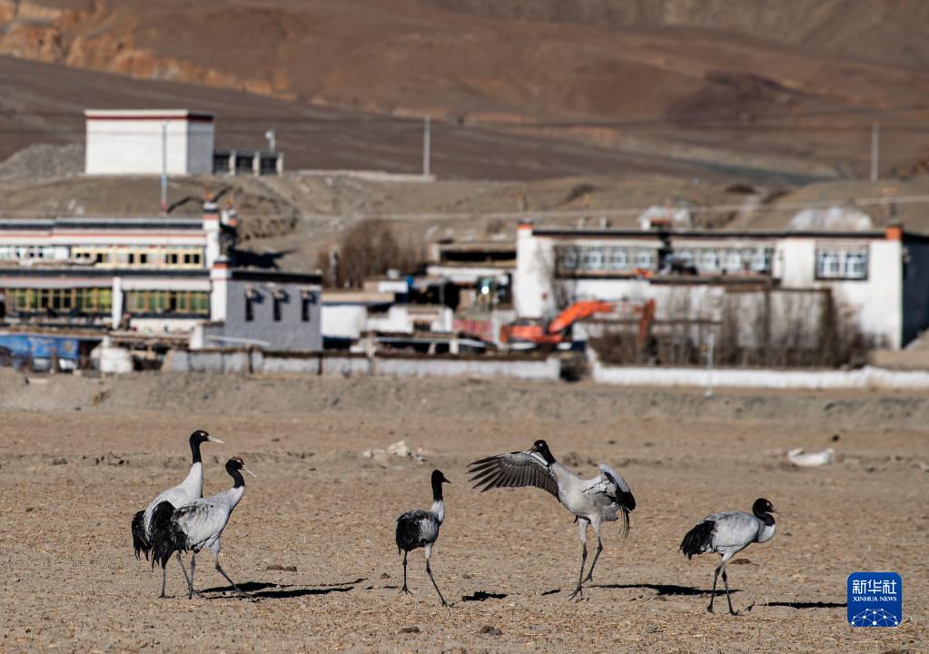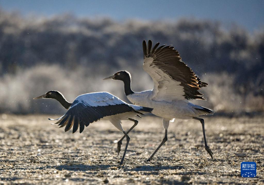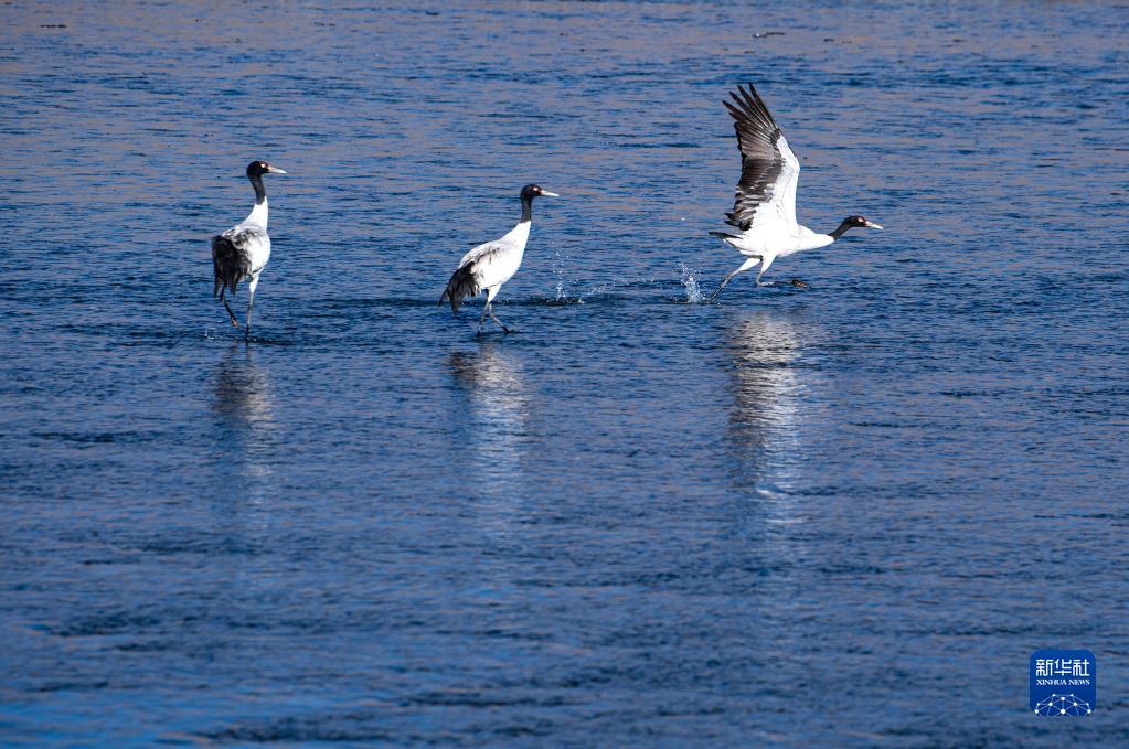 在西藏雅魯藏布江中游河谷黑頸鶴國家級自然保護區(qū)日喀則市拉孜縣越冬的黑頸鶴(1月23日攝)。新華社記者 孫非 攝