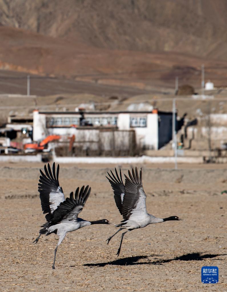 在西藏雅魯藏布江中游河谷拉孜縣農(nóng)區(qū)越冬的黑頸鶴(1月23日攝)。新華社記者 孫非 攝