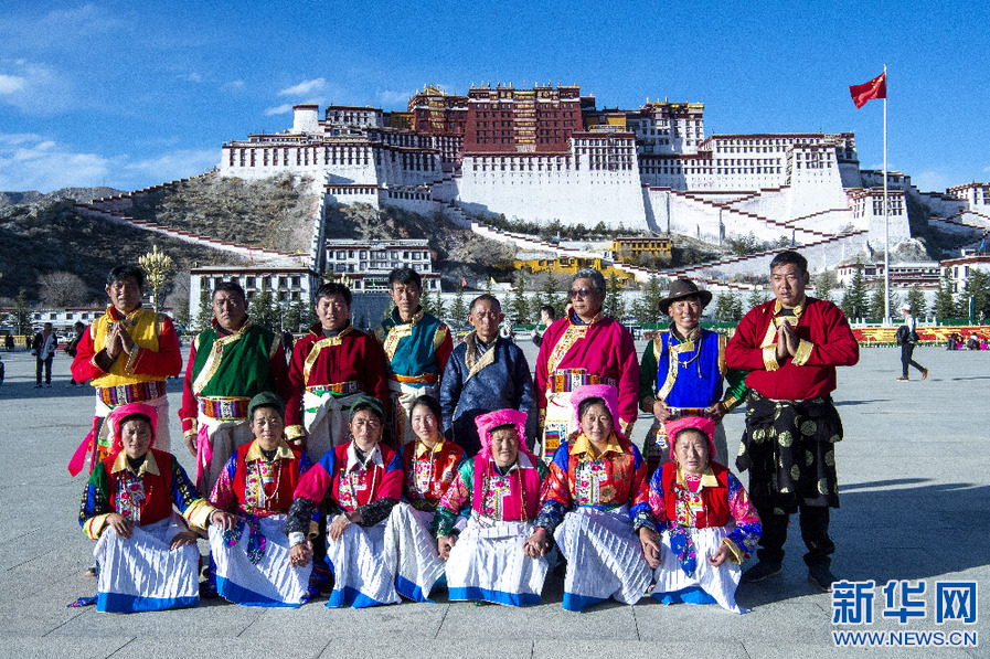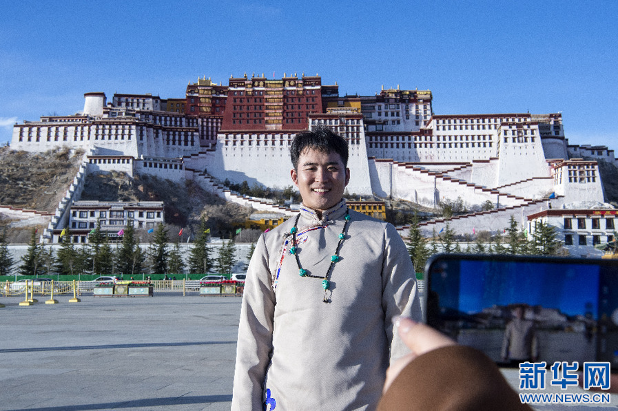 來自云南的游客在布達拉宮廣場拍照留念(1月30日攝)。新華網(wǎng) 旦增努布 攝