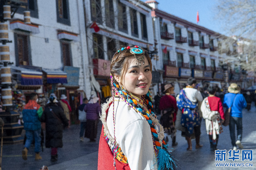 一名游客在八廓街拍照留念(1月30日攝)。新華網(wǎng) 旦增努布 攝