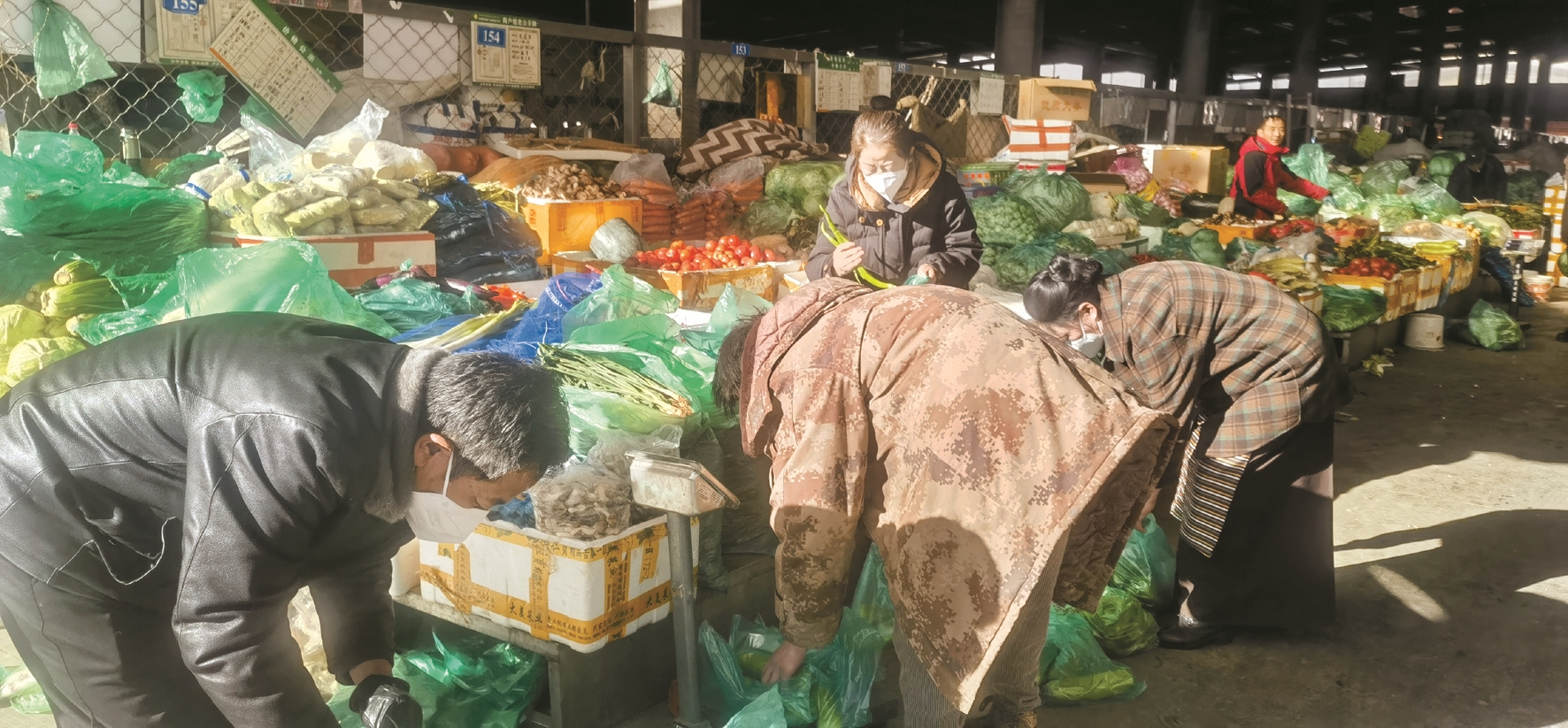 圖為在拉薩東嘎農副產品批發(fā)市場蔬菜銷售區(qū),市民在購買蔬菜。拉薩融媒記者 楊 璐攝
