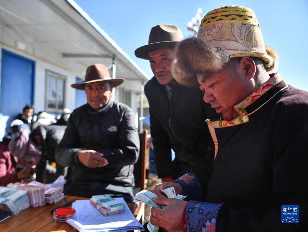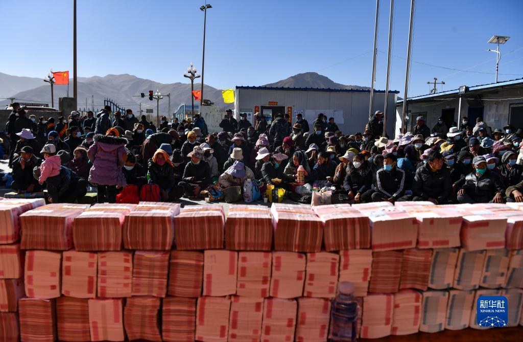 滴新村村民在現場領取分紅現金(2月2日攝)。新華社記者 晉美多吉 攝