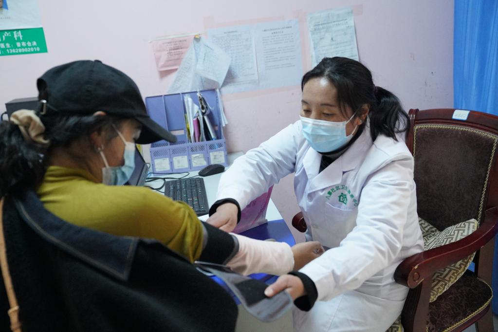 醫(yī)生為拉薩市八廓街道居民次仁卓瑪(右)測量血壓。新華社記者黃耀漫 攝