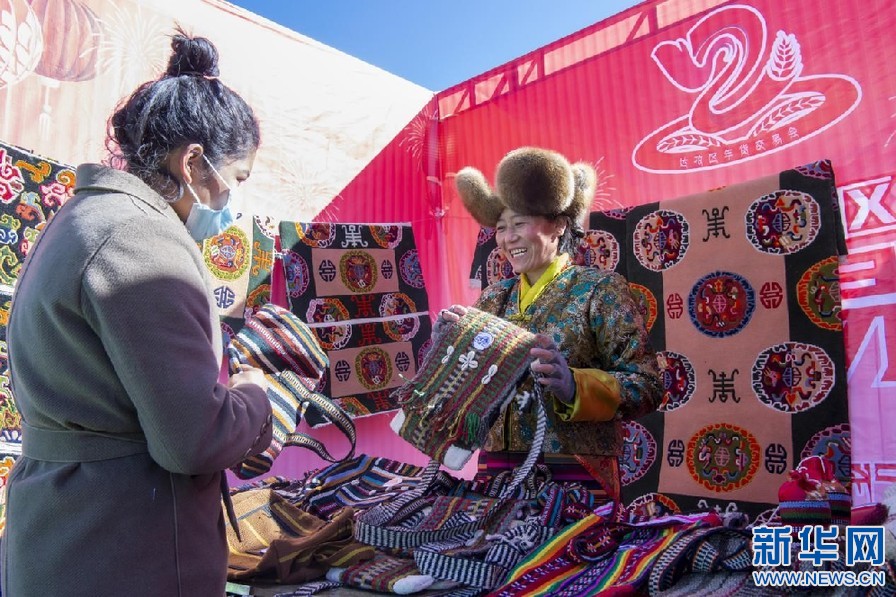 2月6日,達孜區(qū)旦卓婦女卡墊專業(yè)合作社工作人員在交易會上推銷傳統(tǒng)手工制品。新華網旦增努布攝