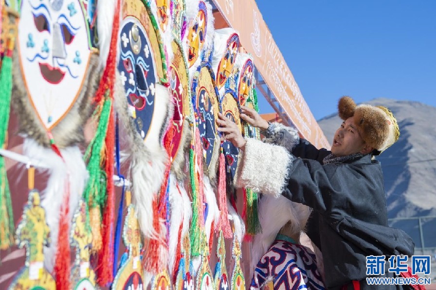 2月6日,達孜區(qū)阿古傳統(tǒng)藏戲服飾農牧民專業(yè)合作社工作人員在交易會上推銷藏戲面具。新華網 旦增努布 攝