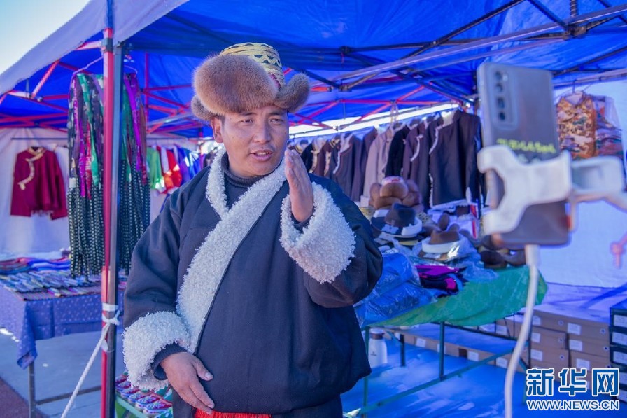 2月6日,商戶在交易會上通過直播介紹年貨。新華網 旦增努布 攝