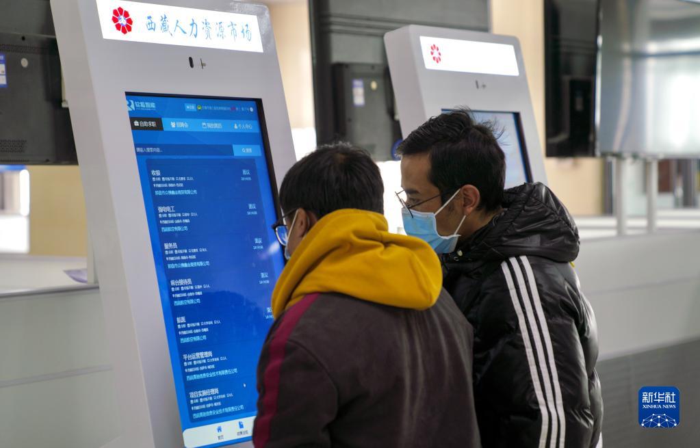 2月8日,求職者在西藏2023年“春風行動”暨就業(yè)援助月招聘活動現(xiàn)場尋找崗位。新華社發(fā)(旦增努布攝)