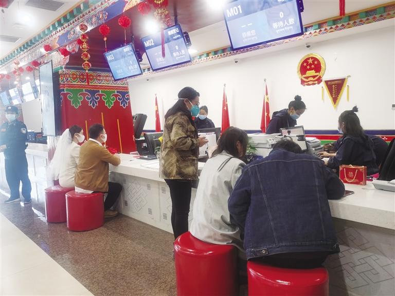 14日一大早,記者在拉薩三級政務服務大廳婚姻登記處看到,大廳里坐滿了前來登記領(lǐng)證的情侶,工作人員正在有序地為新人辦理證件。記者注意到,前來登記領(lǐng)證的新人或手捧鮮花,或頭戴白紗,或好友一路跟拍,臉上洋溢著幸福的笑容。為了營造浪漫的節(jié)日氛圍,婚姻登記處的工作人員也在大廳和禮堂內(nèi)精心擺放了寓意為“百年好合”的百合花。