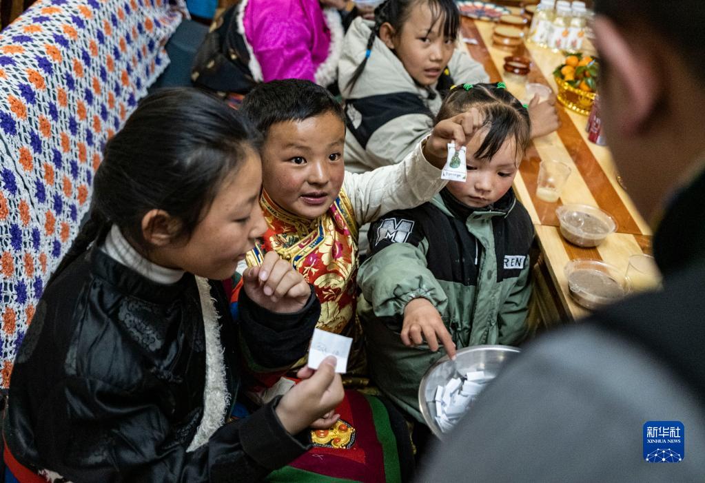 在位于森布日安置點(diǎn)的家中,石秀次仁家的孩子們在向家人展示自己隨機(jī)拿取的小紙條。畫在紙條上的圖案有著不同的寓意(2月19日攝)。