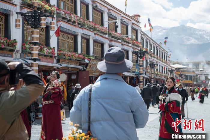 3月14日,游客穿上藏族傳統(tǒng)服飾在拉薩市八廓街拍照留念。 中新社記者 貢嘎來松 攝