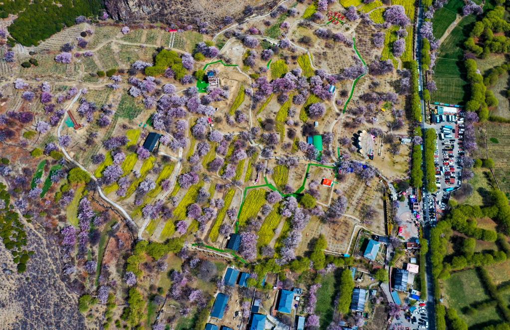 鳥瞰桃花盛開的嘎拉村,停滿了旅游車輛(無(wú)人機(jī)照片,3月24日攝)。新華社記者 姜帆 攝
