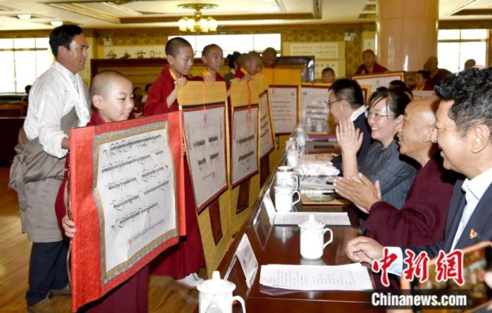 2022年7月,西藏佛學(xué)院9名少年活佛完成小學(xué)階段學(xué)習(xí),在拉薩順利畢業(yè)。圖為少年活佛們在畢業(yè)典禮教育成果展上展示藏漢書法作品。李林 攝