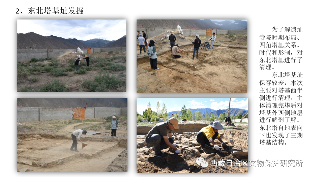 本年度基本厘清了西南、東北兩座佛塔的始建、維修和復建等分期關系,確定了西南塔早期塔基為溫江多遺址早期建筑遺址,大量使用琉璃質磚、瓦等建筑材料為其重要特點。遺址西區(qū)探方內發(fā)現(xiàn)的墻址、房址,以及五峰山北麓調查發(fā)現(xiàn)的修行洞、居址等重要遺跡,為了解溫江多遺址整體布局、不同時期的寺院結構提供了重要線索。