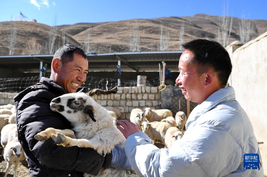 西卡學(xué)村養(yǎng)殖合作社負(fù)責(zé)人邊覺(左)在向西卡學(xué)村黨總支第一書記兼駐村工作隊(duì)副隊(duì)長李德林介紹綿羊養(yǎng)殖及銷售情況(4月5日攝)。新華社記者 張汝鋒 攝