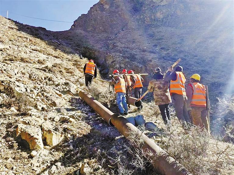 圖為中鐵二十一局工人在巴嘎雪片區(qū)將主鋼管轉(zhuǎn)運至焊接點位。 記者 楊小娟 攝