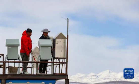 達(dá)瓦扎西(右)和同事扎西平措一起在檢查觀測(cè)儀器(4月13日攝)。新華社記者 姜帆 攝