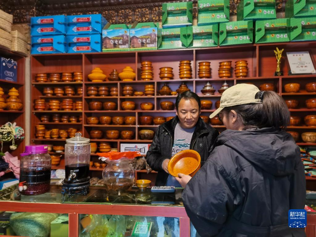 4月24日,游客在山南錯(cuò)那市麻麻鄉(xiāng)次仁家的民宿中購(gòu)買木碗。新華社記者 劉洪明 攝