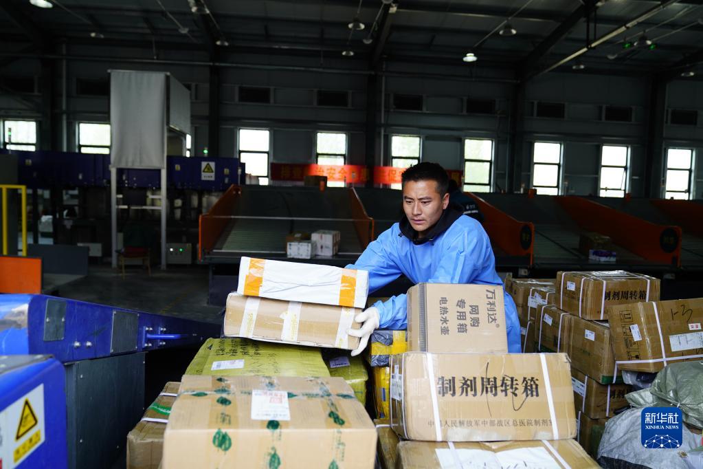 在中國(guó)郵政集團(tuán)有限公司山南市分公司郵件處理中心,員工正在裝運(yùn)快遞。新華社記者 劉洪明 攝