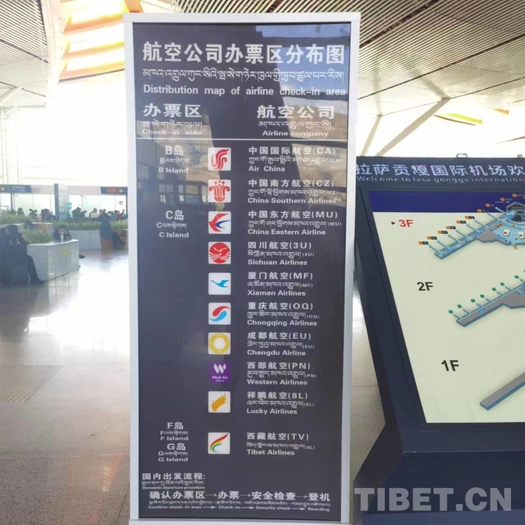 無托運行李的旅客持個人身份證(或有效證件)前往自助值機區(qū)打印登機牌。有托運行李和中轉聯(lián)程航班的旅客前往人工柜臺辦理。其中,乘坐西藏航空公司航班的旅客進入出發(fā)大廳后左轉前往F、G島辦理乘機手續(xù),其他航空公司的旅客請前往B、C、D島辦理乘機手續(xù)。