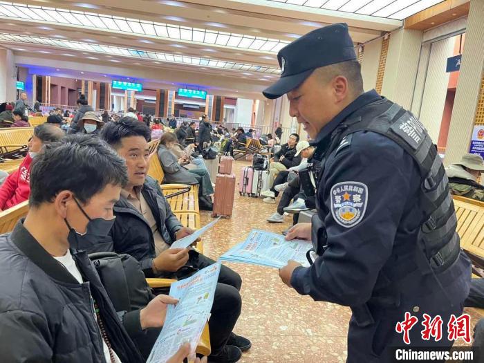 圖為拉薩鐵路公安民警為游客發(fā)放宣傳冊?!∝暩聛硭伞z