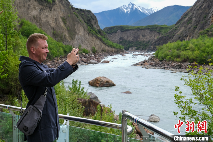 圖為5月16日,參訪團成員在雅魯藏布江畔拍照。 中新社記者 江飛波 攝