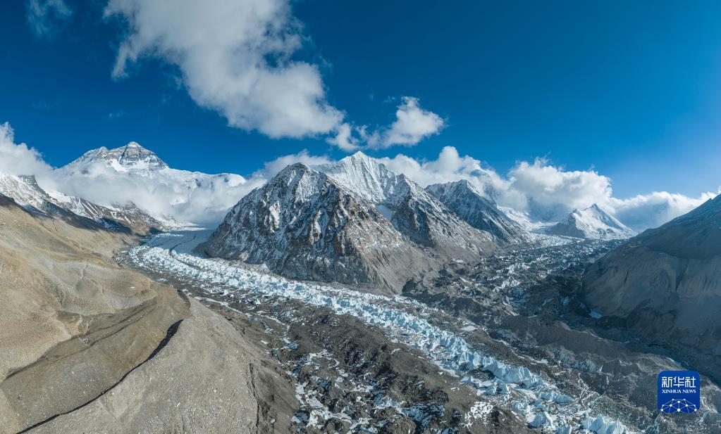 這是珠峰腳下中絨布冰川(左)和西絨布冰川(右)的匯合處(5月16日攝,無人機(jī)拼接照片)。新華社記者 孫非 攝