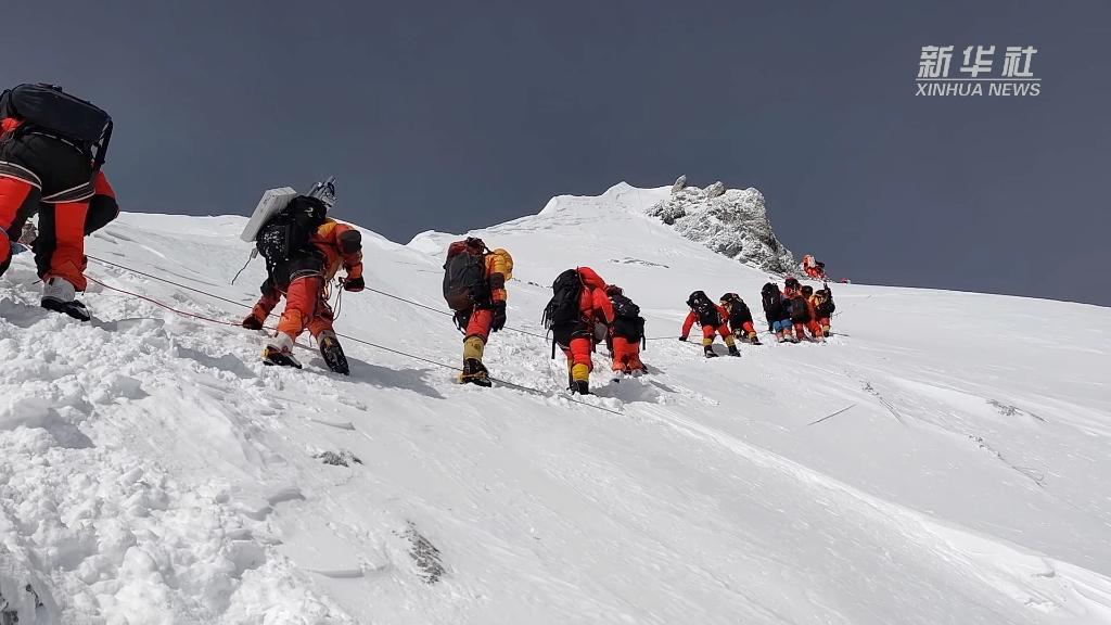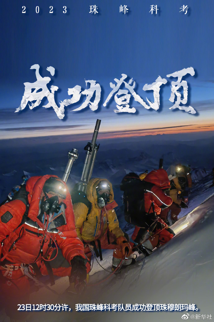 這是我國珠峰科考繼2022年之后,再次突破8000米以上海拔高度。當(dāng)日,科考隊(duì)員在珠峰峰頂利用科學(xué)儀器,采集珠峰峰頂?shù)难┍鶚悠?,用于分析氣候環(huán)境指標(biāo)。