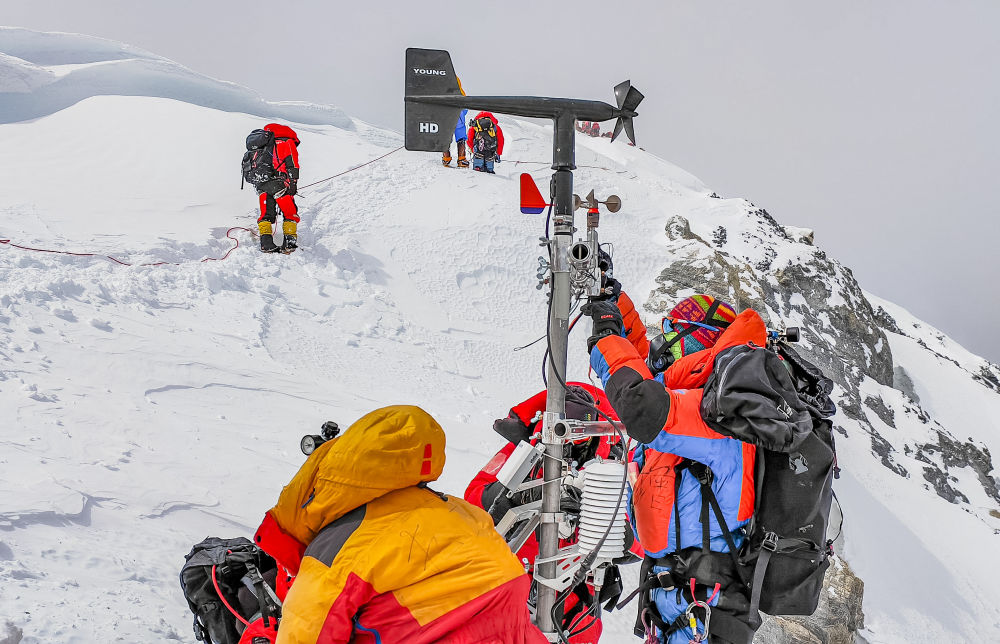 當(dāng)日凌晨3時,科考隊員從海拔8300米的突擊營地出發(fā),歷經(jīng)數(shù)小時攀登,終于抵達海拔8830米的世界最高自動氣象觀測站。固定鋼筋繩索,更換蓄電池,安裝風(fēng)速風(fēng)向傳感器……經(jīng)過約1小時的緊張工作,氣象站零部件升級工作全部完成。隨后,他們攀登至8848.86米的峰頂,利用工具成功采集雪冰樣品。