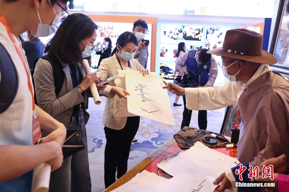 5月23日,“2023·中國(guó)西藏發(fā)展論壇”在北京舉行。會(huì)場(chǎng)外,活潑獨(dú)特的藏式迎賓舞蹈、展示西藏人文自然風(fēng)貌的圖片,已在論壇開(kāi)幕前預(yù)熱起探討西藏新發(fā)展的氛圍。圖為藏族藝人現(xiàn)場(chǎng)進(jìn)行藏文書法創(chuàng)作并將作品贈(zèng)送給來(lái)賓。