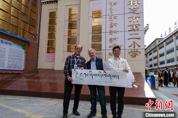 圖為5月18日,柯馬凱(左一)在林芝市第二小學(xué)參訪時(shí)獲得學(xué)校贈(zèng)予的藏文書法作品“扎西德勒”。中新社記者 江飛波 攝