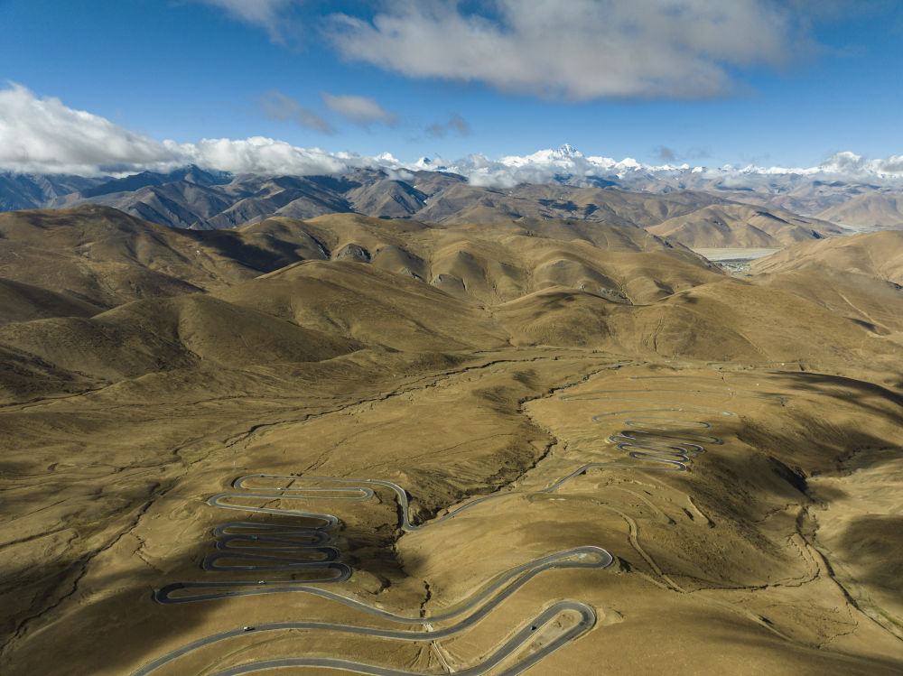 這是在海拔6000米左右高空拍攝的通往珠峰的公路(5月26日攝,無人機(jī)照片)。新華社發(fā)(旦增努布 攝)