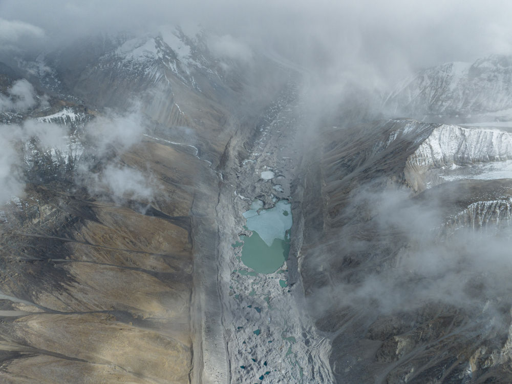 這是在海拔7000米左右高空拍攝的由絨布冰川融水形成的湖泊群(5月25日攝,無人機(jī)照片)。新華社發(fā)(旦增努布 攝)
