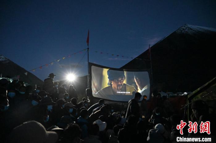 晚上9時(shí)許,山谷沉入暮色,吃過(guò)晚飯,電影放映員見(jiàn)參開啟設(shè)備放映了藏語(yǔ)版《湄公河行動(dòng)》。前來(lái)觀看電影的村民席地而坐,不似都市電影院,在這沒(méi)有影院標(biāo)配座椅、爆米花,卻有著星空下的超級(jí)觀感體驗(yàn)。