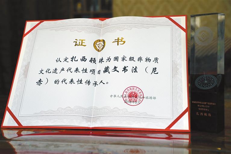 2018年,扎西頓珠被評為國家級非物質文化遺產(chǎn)代表性項目藏文書法(尼赤)的代表性傳承人。