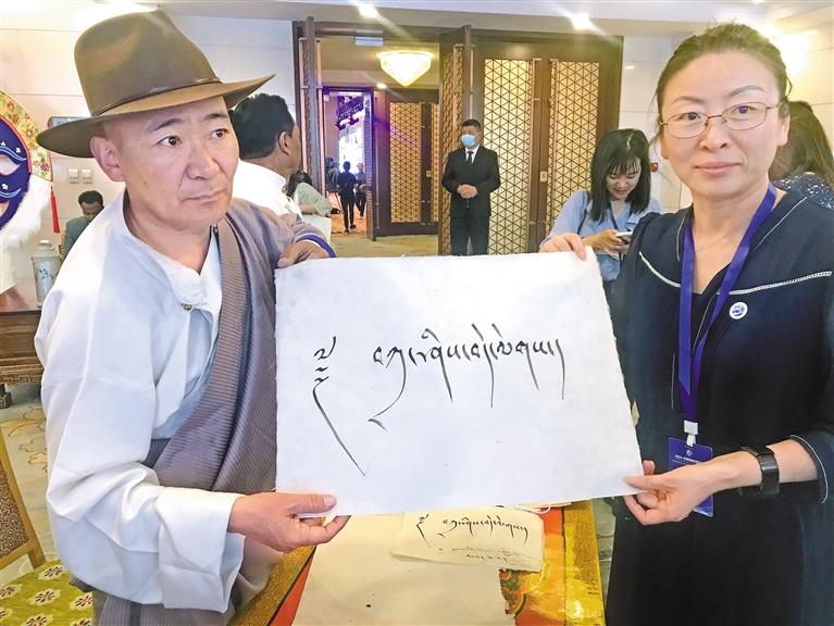 論壇會上,鋪開獨特的藏紙,手持光潤的竹筆,48歲的藏文書法家扎西頓珠鄭重寫下“扎西德勒”四個字,贈予前來參會的中外嘉賓。作為國家級非物質文化遺產(chǎn)代表性項目藏文書法(尼赤)的代表性傳承人,扎西頓珠希望讓更多人感受并了解西藏傳統(tǒng)書法之美。“這次論壇期間,我先后向中外嘉賓送上了300多幅書法作品,我們藏族傳統(tǒng)文化能被全世界看見并受到喜愛,推動各民族交往交流交融,感到非常開心和自豪?!眲倧谋本┗貋聿痪茫e不住的扎西頓珠又在準備參加藏博會的書法作品,傳播藏文書法文化。