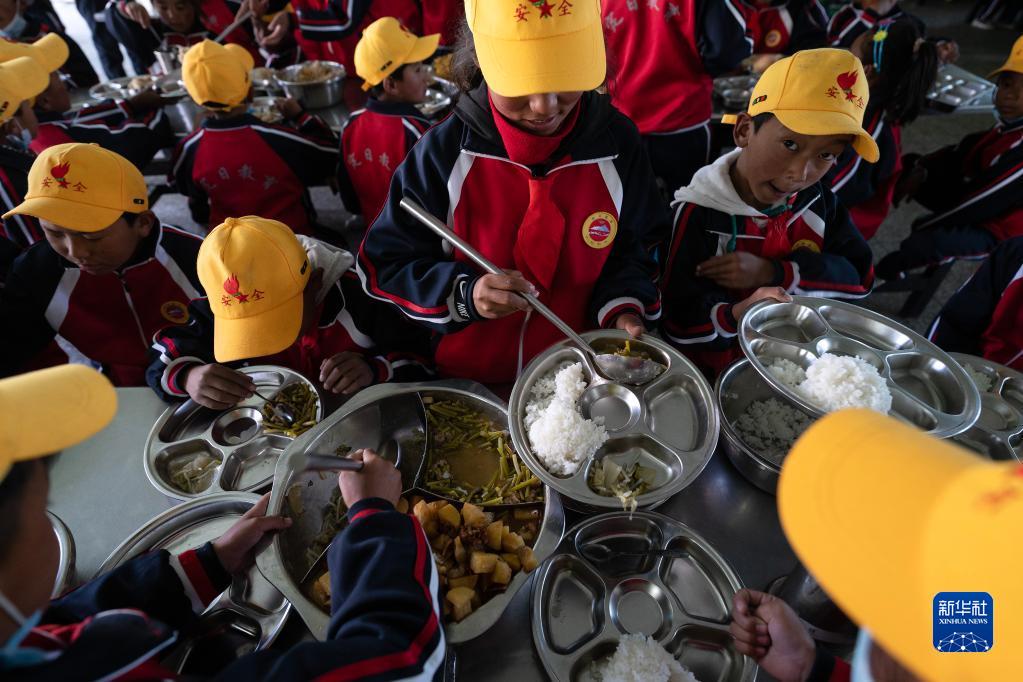 6月5日,扎西宗鄉(xiāng)完全小學(xué)的學(xué)生在食堂吃午飯,值日生負(fù)責(zé)給大家打飯菜。新華社記者 費(fèi)茂華 攝