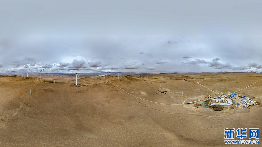 6月9日拍攝的西藏措美哲古風(fēng)電項目風(fēng)電機組和西藏措美哲古風(fēng)電廠(無人機全景照片)。新華網(wǎng) 旦增努布 攝