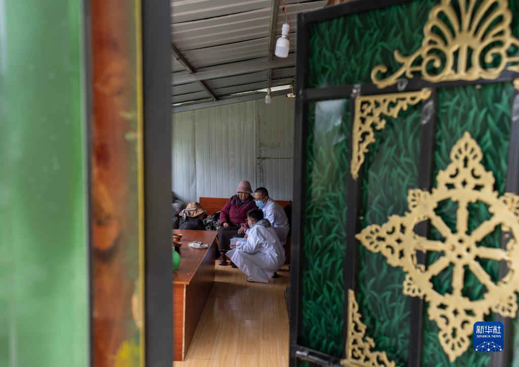 6月12日,王振疆(前右二)、王彤旭(前左一)、陳冰(前右一)和尼瑪益西(前左三)在村委會會議室為患者診治。新華社記者 費(fèi)茂華 攝