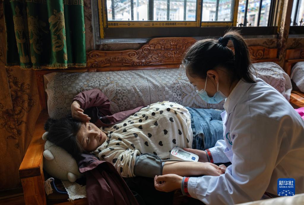 6月12日,王旭彤醫(yī)生在給珠杰檢查身體。新華社記者 晉美多吉 攝
