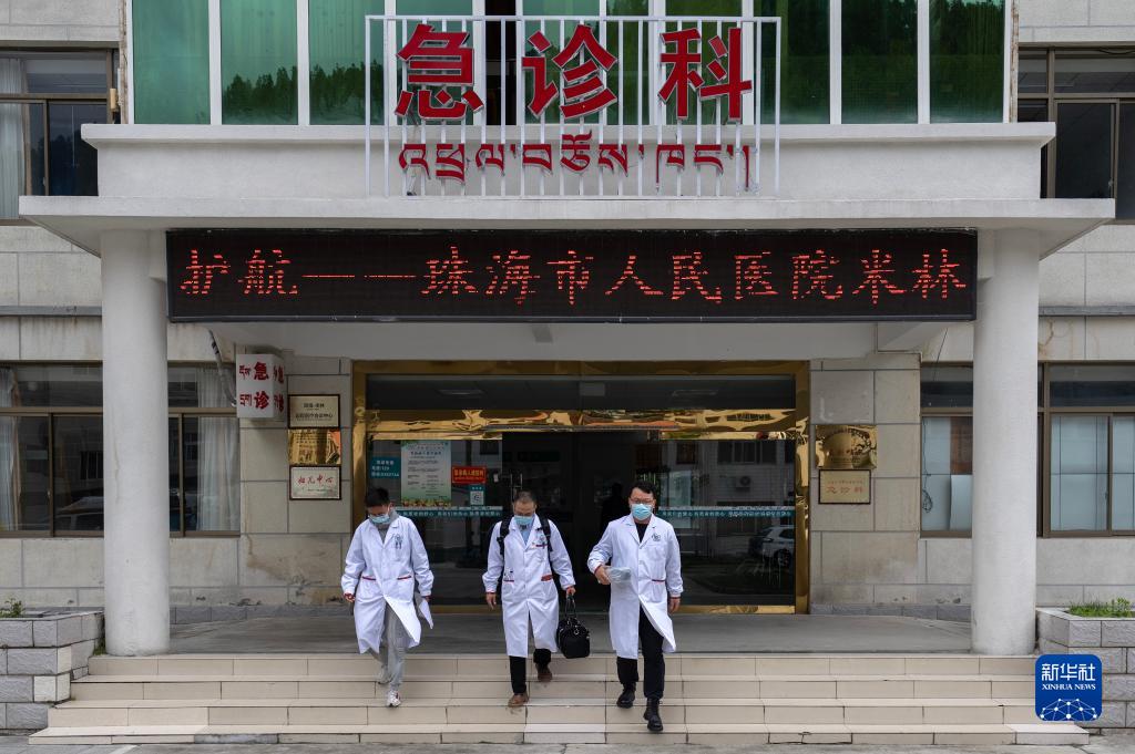 6月12日,王振疆(中)、尼瑪益西(左)和王彤旭走出米林市人民醫(yī)院的急診大樓。新華社記者 費(fèi)茂華 攝