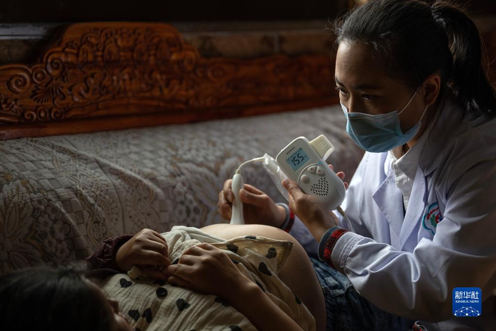 6月12日,陳冰(右)在為懷孕38周的扎西央宗進(jìn)行產(chǎn)檢。新華社記者 邵澤東 攝