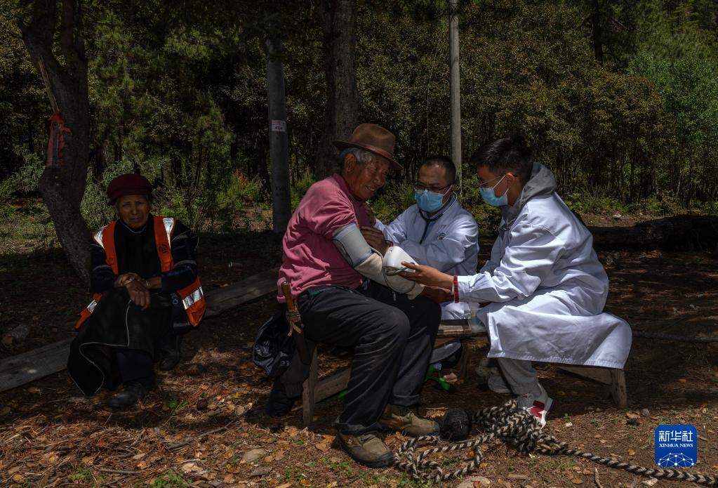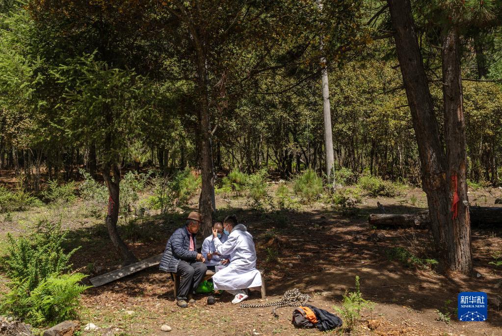 6月12日,在距離吞不絨村幾公里的路旁的樹下,王振疆醫(yī)生(右二)和尼瑪益西醫(yī)生(右一)在給普布多吉檢查身體。新華社記者 晉美多吉 攝