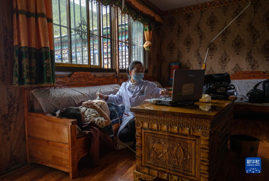 6月12日,王彤旭在吞不絨村為珠杰診治。新華社記者 費(fèi)茂華 攝