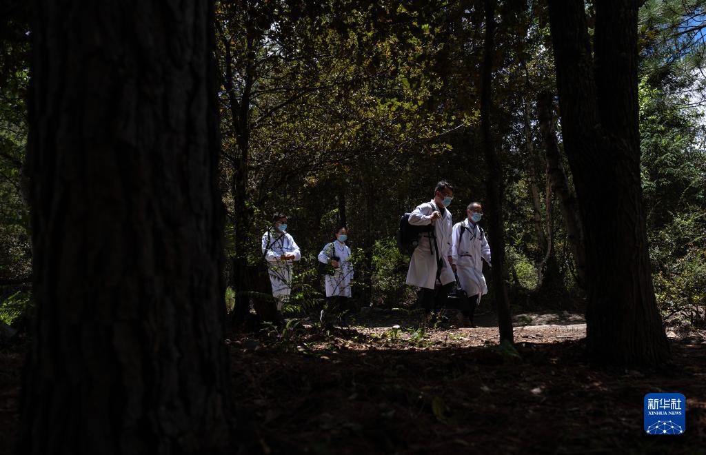6月12日,王振疆(右一)、王彤旭(右二)、陳冰(右三)和尼瑪益西在樹林間行走。新華社記者 費(fèi)茂華 攝