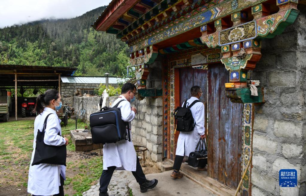 6月12日,王振疆(右)、王彤旭(中)、陳冰(左)來到吞不絨村一戶患者家中送醫(yī)上門。新華社記者 晉美多吉 攝