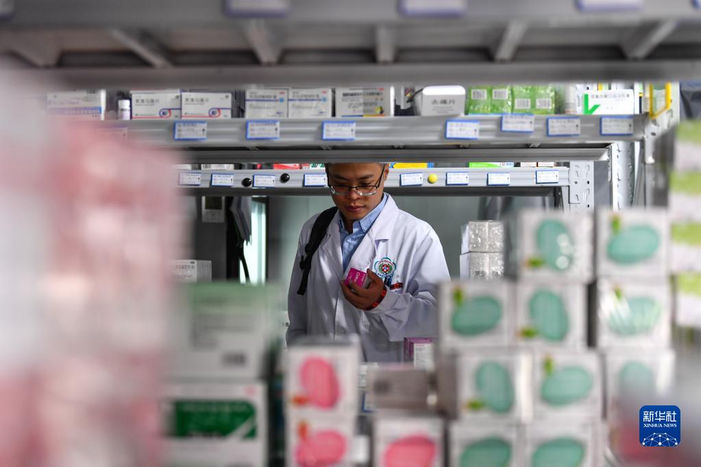 6月12日出發(fā)前,王振疆醫(yī)生在米林市人民醫(yī)院庫房領(lǐng)取藥品。新華社記者 晉美多吉 攝