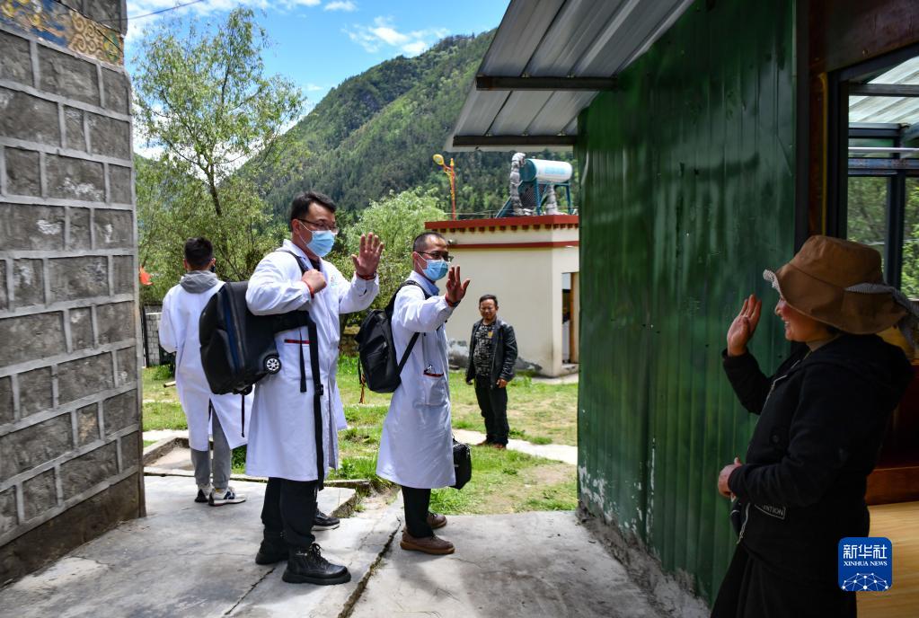 6月12日,王振疆醫(yī)生一行離開時,病人阿珍的女兒(右)和他們揮手告別。新華社記者 晉美多吉 攝